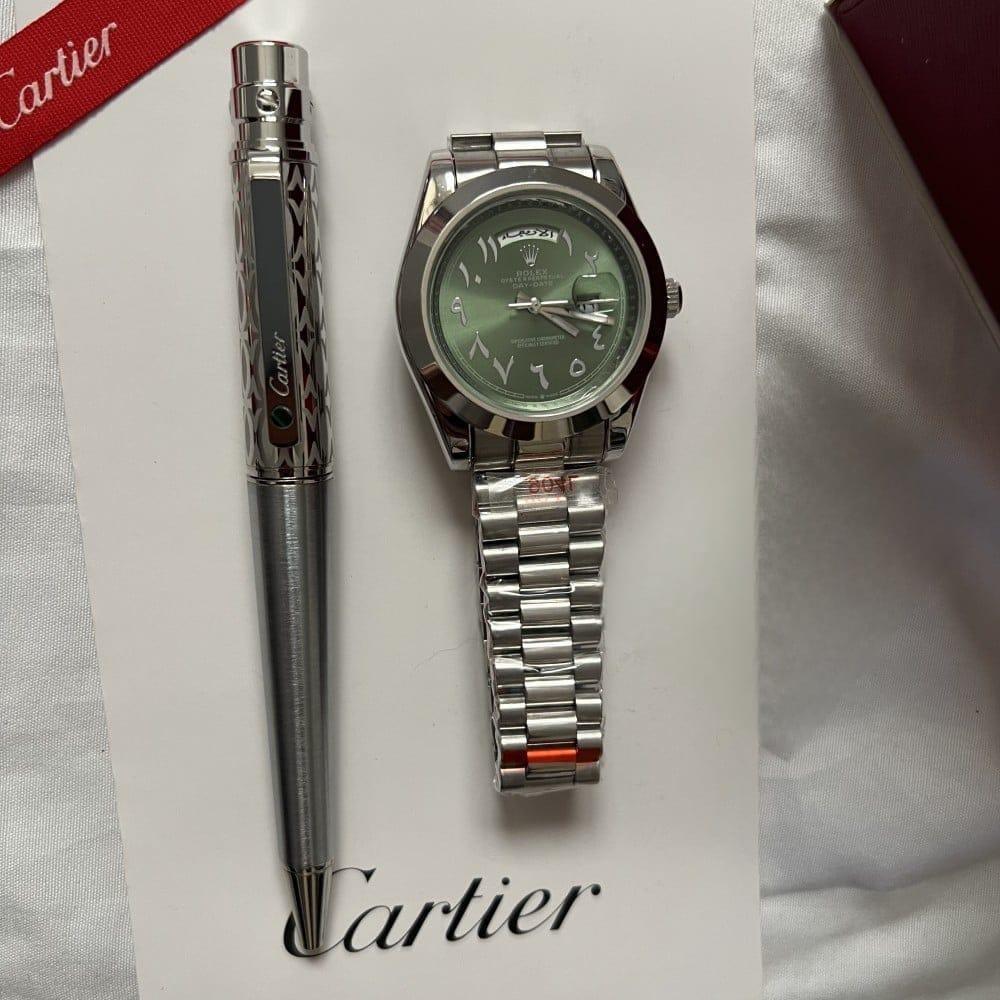 ساعة رولكس رجالي + قلم كارتيرموديل انيق ومميزكوارتزجودة عالية طبق الاصليمقاومة للماءمقاومة للصدأمقاس 38 ممضمان سنه كاملة